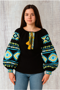 Ukrainian black blouse "Peremoha" Blue and yellow