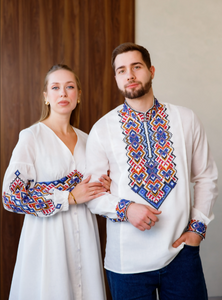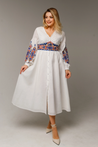 Enjoy the vibrant charm and comfort of our "Marta" dress, beautifully adorned with colorful Ukrainian embroidery. Made from linen blend material, this dress suits any occasion and brings a graceful cultural touch to your wardrobe.
