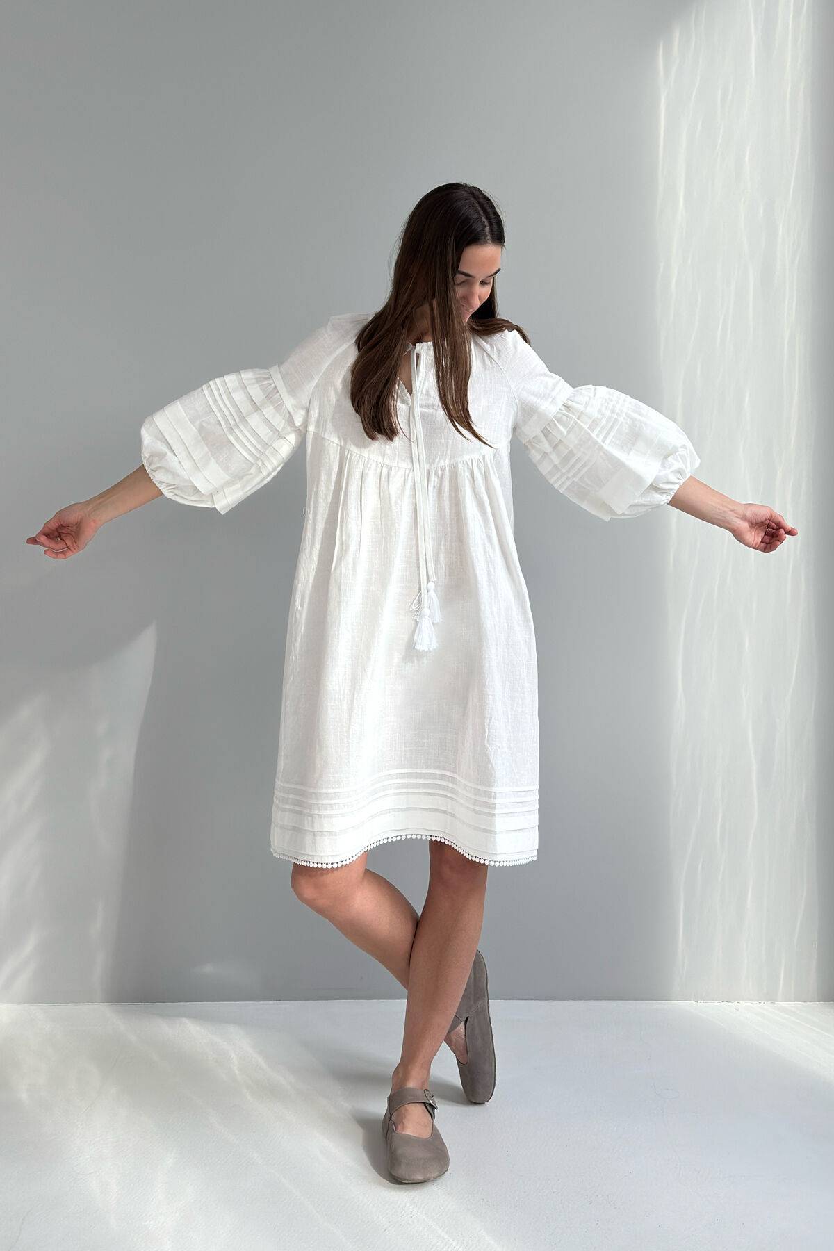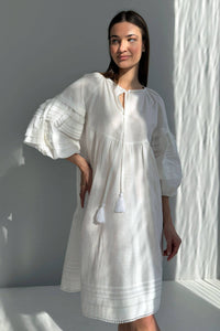 This women's cotton summer dress blends classic heritage with contemporary comfort, creating a must-have addition to your closet. Drawing inspiration from the extended silhouette of a traditional Ukrainian shirt, it showcases raglan sleeves for unrestricted movement and subtle lace accents for a refined look. Made from breathable cotton, it keeps you cool and comfortable throughout the day. Perfect for casual days or holiday adventures, this dress lets you effortlessly express a stylish and distinctive vibe.