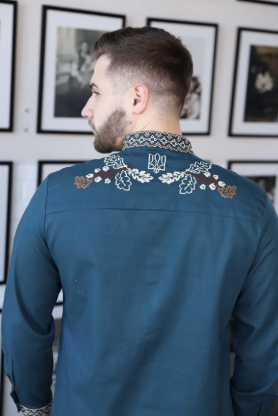 The "Might" vyshyvanka celebrates Ukrainian culture through its symbolic cross-stitch embroidery of an oak tree's branches on a linen blend fabric. The oak tree is revered as one of the most powerful and sacred trees. It represents physical strength, resilience, and longevity, echoing the enduring spirit of the Ukrainian people. In times of war and hardship, the oak is a metaphor for standing tall and unbroken. It is a living reminder of cultural identity, ancestral strength, and hope for the future.  This refined shirt is a respectful tribute to Ukraine’s rich traditions na history, adding a touch of distinction to your look.