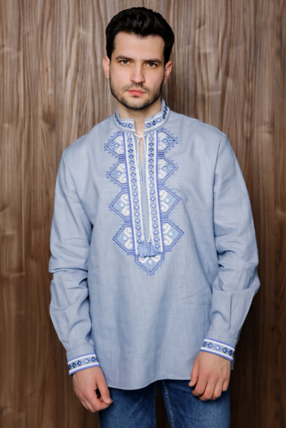 Embrace the timeless beauty of Ukrainian heritage with the "Slava" embroidered shirt, a modern interpretation of the classic Vyshyvanka. Crafted from an ecological light blue linen-nettle fabric, this shirt combines comfort with style, making it an ideal choice for daily wear. The intricate blue and white cross-stitch embroidery adds a delicate yet striking detail that enhances your look with subtle sophistication. Perfect for those who appreciate unique design and cultural authenticity, this shirt elevates your wardrobe with effortless elegance and confidence every day.