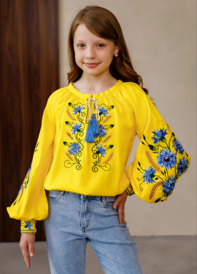 Add a touch of heritage to your young girl's wardrobe with this stunning Ukrainian blouse, showcasing vibrant blue cornflower embroidery. The exquisite floral details offer timeless charm, making it a versatile choice for both special occasions and everyday style. Don't miss the chance to gift her this elegant piece.