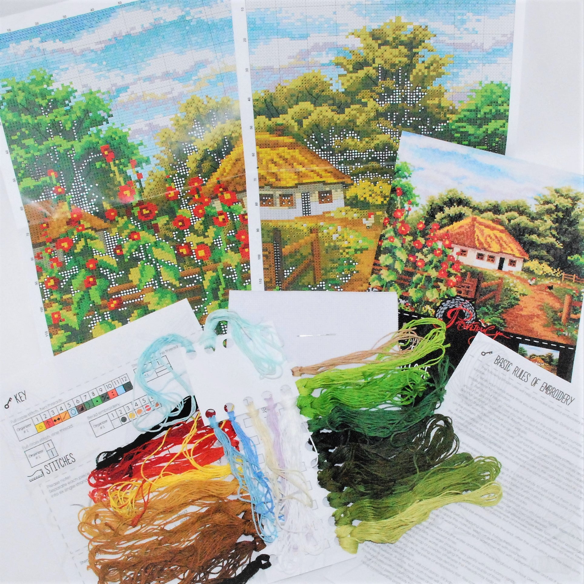 The kit includes the necessary materials to complete the pattern: cotton count fabric, needle, colored embroidery threads, instructional map with a color-coded pattern.
