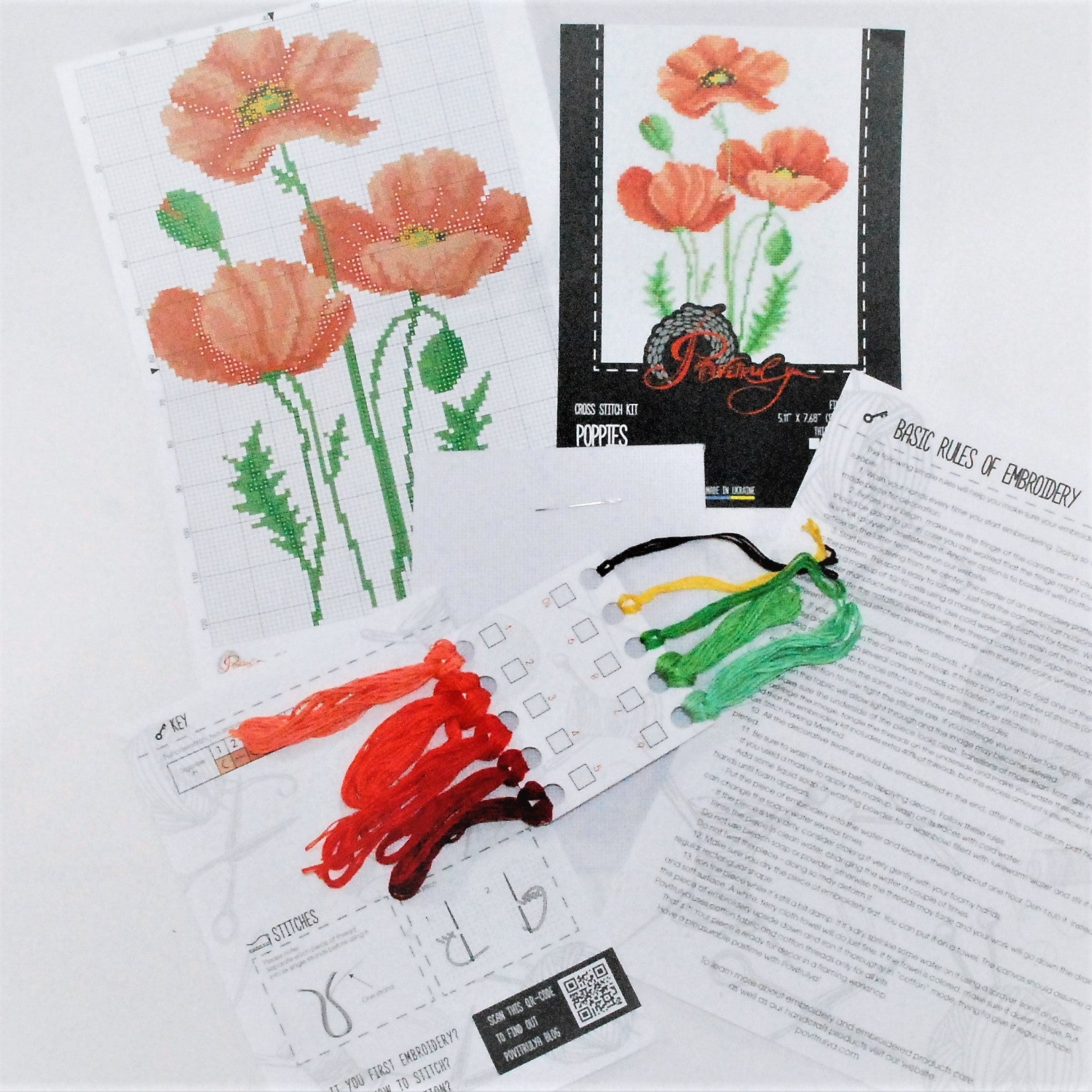 The kit includes the necessary materials to complete the pattern: cotton count fabric, needle, colored embroidery threads, instructional map with a color-coded pattern.