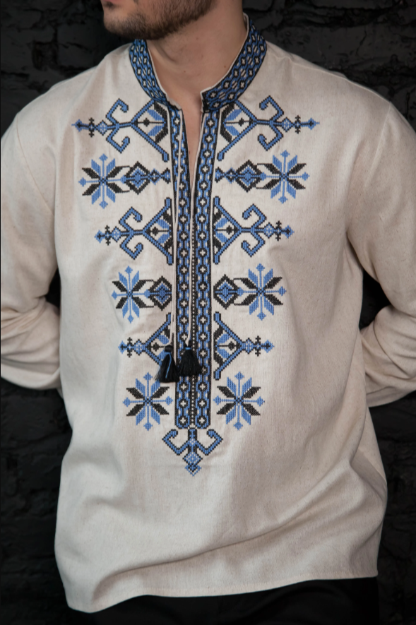 Embrace Ukrainian heritage with the "Kozak" vyshyvanka, featuring striking cross-stitch embroidery on a breathable linen blend fabric. Its timeless elegance and vibrant design make it a standout piece that combines style with comfort, perfect for warm days. This distinguished shirt honors Ukraine’s rich traditions while elevating your wardrobe with a unique and sophisticated touch.
