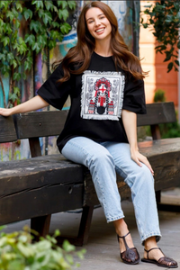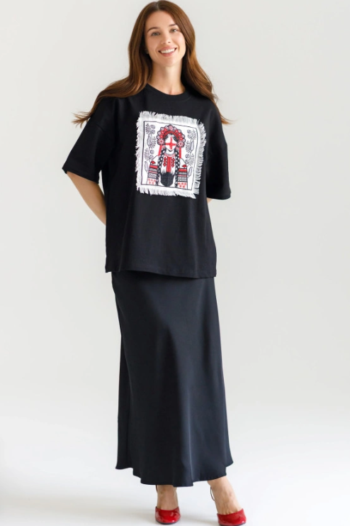 Discover the perfect blend of contemporary style and cultural artistry with our Women's Oversized Black T-Shirt "Motanka." This statement piece features an eye-catching Motanka embroidery patch on the front, bringing traditional Ukrainian folk art into modern fashion. The relaxed oversized silhouette offers effortless comfort and versatility, flattering every body type while allowing you to move freely throughout your day. Crafted from quality fabric, this tee transitions seamlessly from casual weekend wear to layered styling options. Whether you're celebrating your heritage or simply appreciate unique, meaningful design, this t-shirt makes a bold fashion statement that sparks conversation. Elevate your everyday wardrobe with a piece that honors tradition while embracing contemporary aesthetics.
