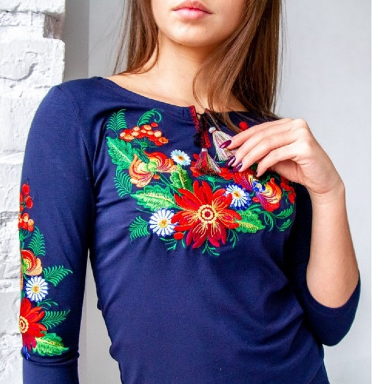 Enchanting 3/4 sleeve shirt with gorgeous floral embroidery. Delicate satin stitching on the front and sleeves is the main attractiveness of the shirt. It's like wearing a beautiful Petrykivka art.