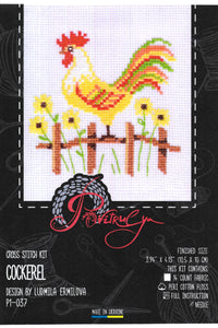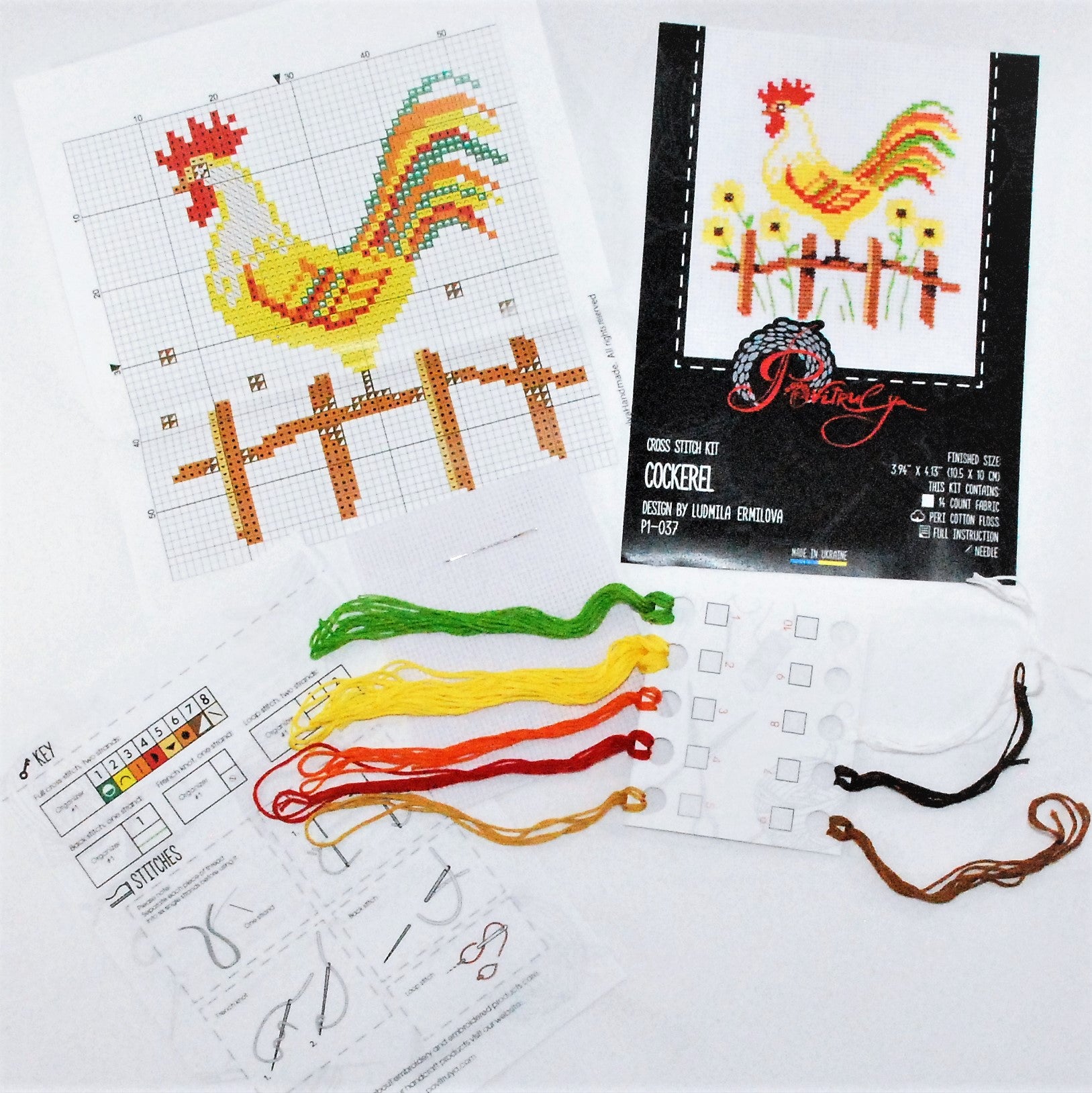 The kit includes the necessary materials to complete the pattern: cotton 14 count fabric, needle, colored embroidery threads, instructional map with a color-coded pattern.