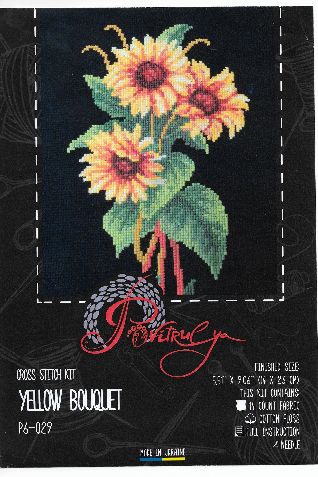 The kit includes the necessary materials to complete the pattern: cotton count fabric, needle, colored embroidery threads, instructional map with a color-coded pattern.