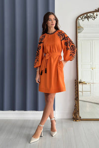 This Ukrainian fashion dress, "Kvitana," showcases a vibrant orange hue that brings energy and warmth to your wardrobe. Its traditional folk silhouette is beautifully complemented by a unique ethnic print on the sleeves, highlighting authentic craftsmanship made with care in Ukraine. Designed to blend classic charm with modern elegance, this dress offers both style and comfort, making it ideal for various occasions. Whether you're attending a cultural event or seeking a standout piece for everyday wear, "Kvitana" ensures you express your individuality with grace and confidence.