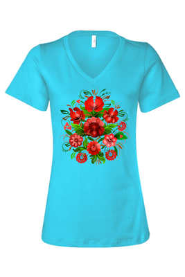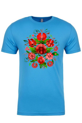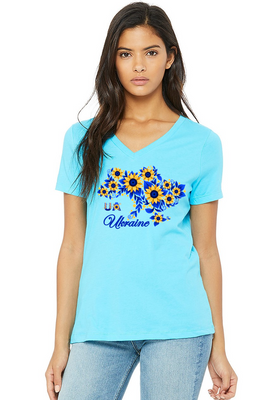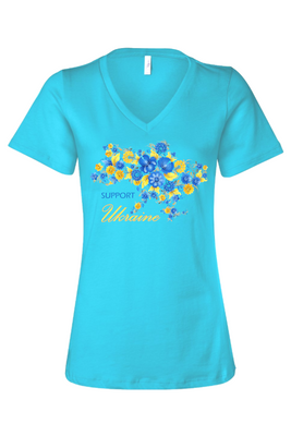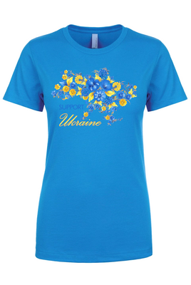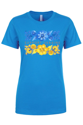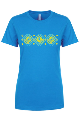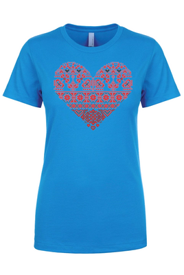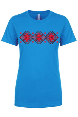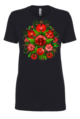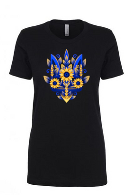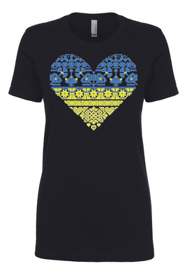 Ladies' t-shirts adorned with traditional Ukrainian designs applied in different decoration techniques: embroidery, digital print, htv including glitter and metallic transfers. Embrace the beauty and heritage of Ukraine with our unique selection of high-quality t-shirts. Showcase your national pride and support for Ukraine at this difficult time of war waged again by #terroristrussia.