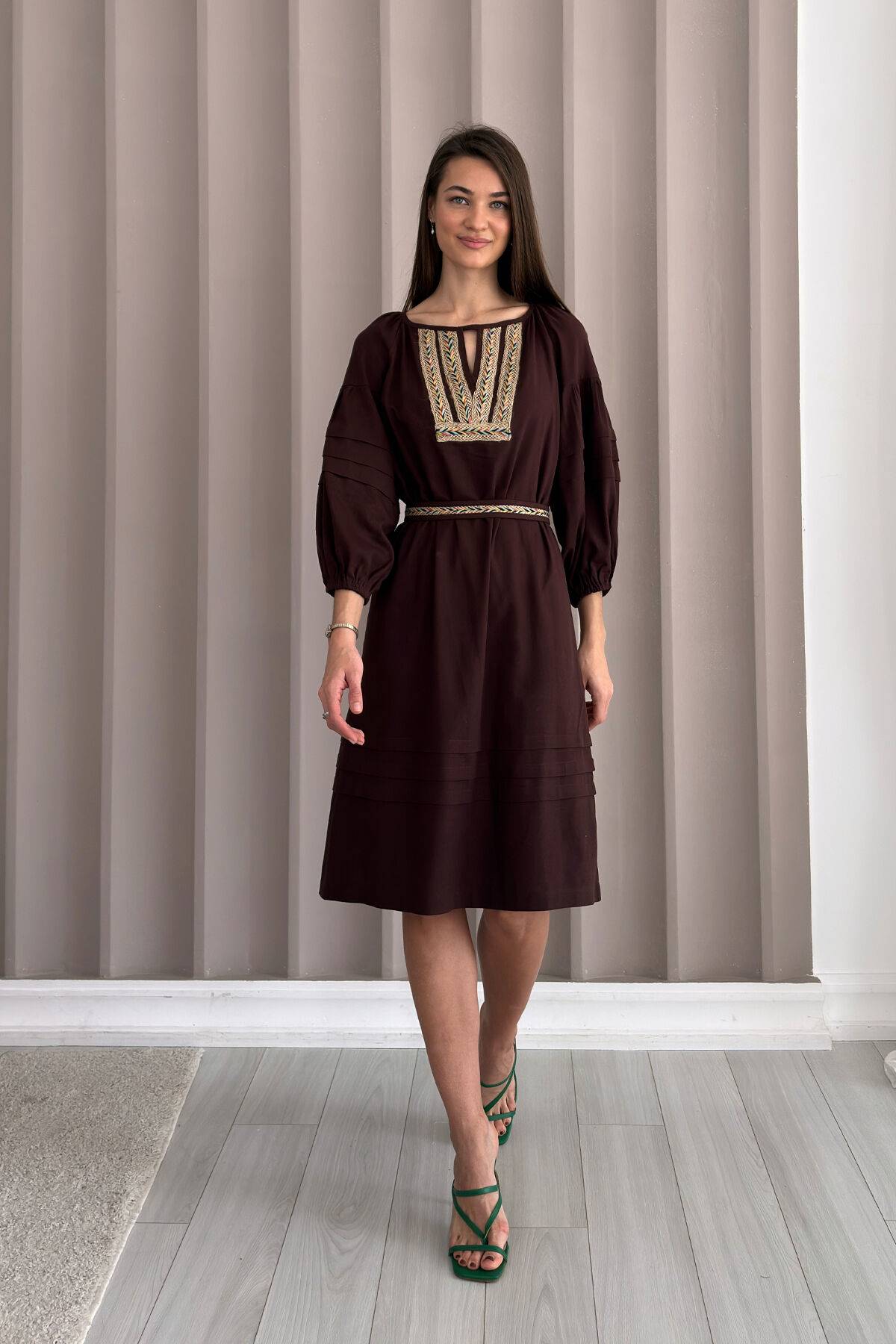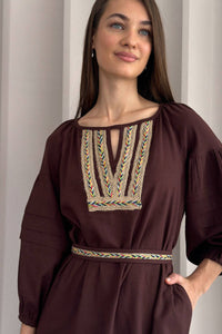 This deep chocolate color linen dress for women combines timeless elegance with modern ease, making it an essential piece for your wardrobe. Highlighted by twine and vibrant thread accents on the front, it features raglan sleeves that allow free movement and a coordinating belt for a polished finish. Crafted from breathable natural linen, it ensures all-day comfort and a cool feel. Ideal for relaxed outings or vacation escapes, this dress helps you showcase a chic and unique style with ease.