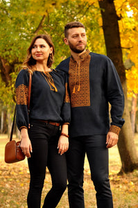 Women's linen Vyshyvanka. Navy shirt with orange embroidery